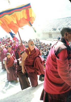 | Rinpoche's first return to one of his monasteries - Zarthu Monastery, since leaving for Lhasa from here at the age of 17. The historical Zarthu was next to its present site and was completely destroyed in the 1960's. When it was given permission to be rebuilt in the 1980's as religious regulations relaxed, the old site was occupied and the monks chose the site of the house where Rinpoche was born to build the new monastery.The exact spot where Rinpoche was born is almost exactly where Rinpoche has set his foot on in this photo. |