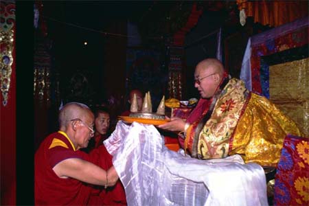 Dhe-Tsang Monastery's resident lama Nyima Rinpoche offering a mandala to the abbot Khejok Rinpoche.